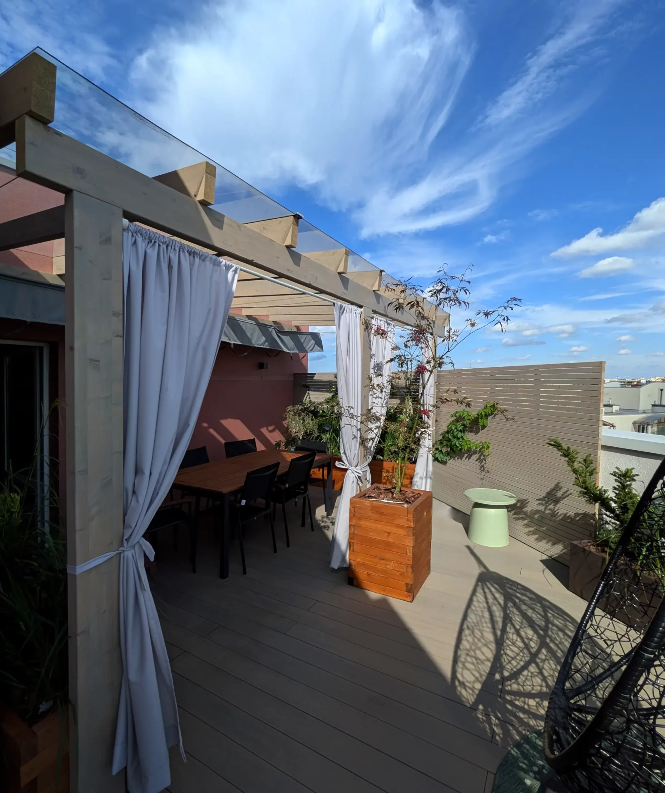 W nowoczesnym budownictwie w dużych miastach taras może być stać się naturalnym przedłużeniem salonu. To dodatkowa przestrzeń, służąca odpoczynkowi, spożywaniu posiłków czy miłym spotkaniom z przyjaciółmi. Nasza realizacja – aranżacja tarasu o powierzchni 30 m² w Warszawie – pokazuje, że nawet w centrum miasta można stworzyć zieloną oazę z przytulnym klimatem.