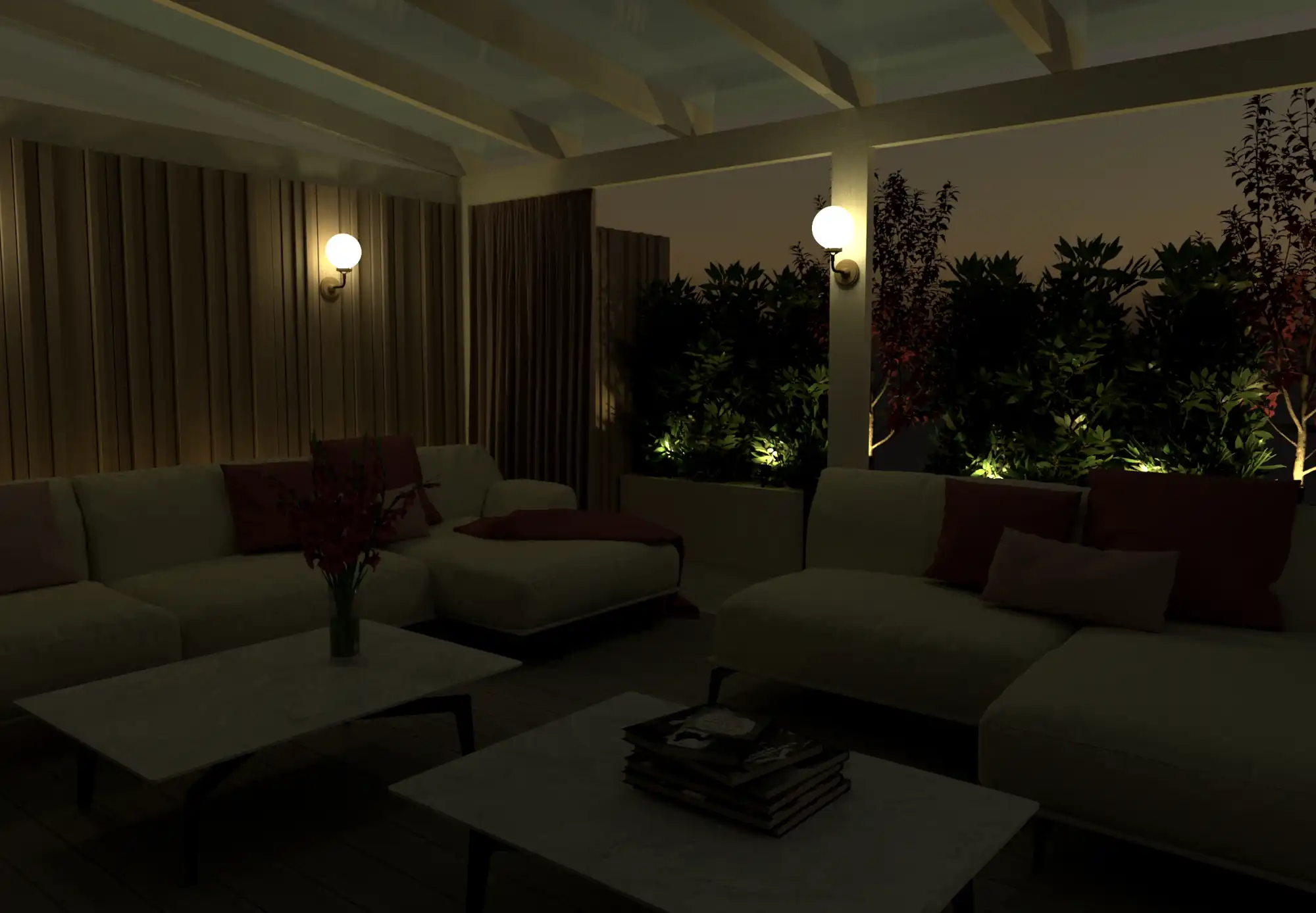 W nowoczesnym tarasie miejskiego apartamentu oświetlenie odgrywa kluczową rolę. Nasi klienci często pracują w nielimitowanych godzinach i zmrok nie może zniweczyć planów na relaks po trudnym dniu. Zastosowane przez nas rozwiązania budują atmosferę po zachodzie słońca i podkreślają strukturę przestrzeni. Punkty świetlne zostały rozmieszczone w taki sposób, aby w nienachalny sposób wydobyć faktury materiałów, zaakcentować zieleń w donicach, stworzyć przytulny, wieczorny klimat, zapewnić komfort i bezpieczeństwo użytkowania. To światło, które nie razi, a pracuje na nastrój. Do tego projektu wybraliśmy prostą listwę LED w pergoli, oprawy punktowe w powierzchni tarasu, ozdobne kinkiety oraz reflektory podkreślające rośliny w donicach.