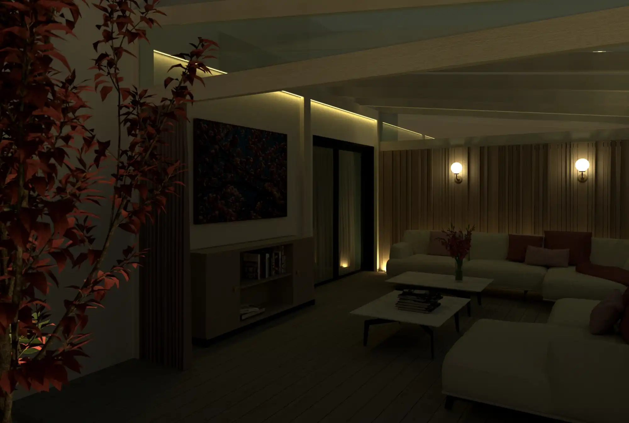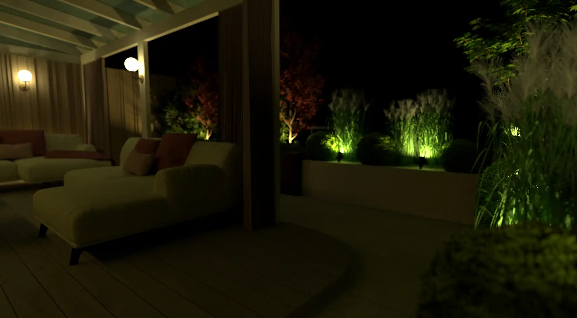 Nastrojowe oświetlenie – nowoczesny taras po zmroku