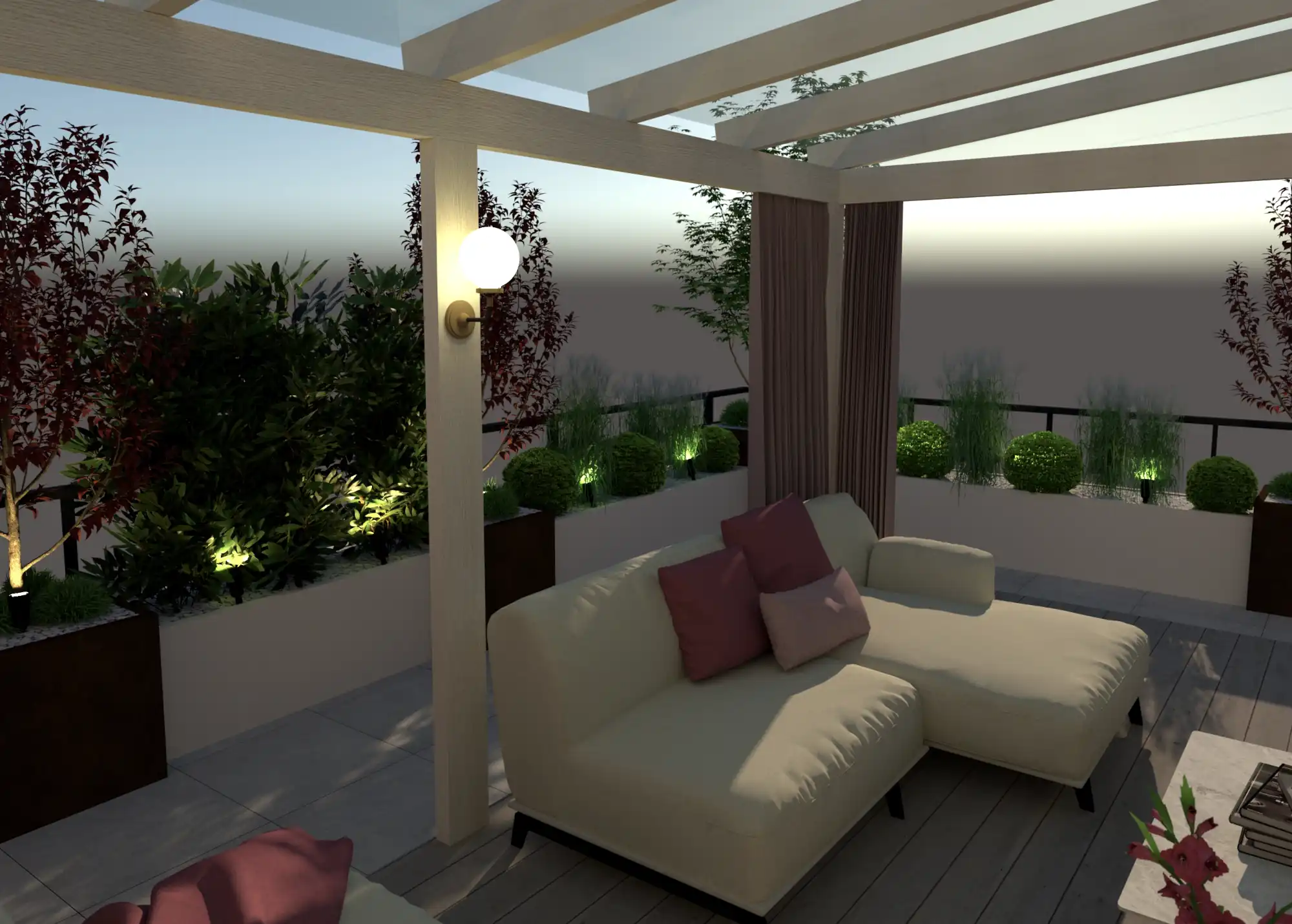Jednym z istotnych elementów każdego projektu tarasu są duże donice na wymiar, zaprojektowane specjalnie do tej przestrzeni. Duże rozmiary pozwalają na zdrowy i bezproblemowy wzrost roślin, a możliwość personalizacji wymiaru, kształtu i koloru sprawia, że doskonale pasują do każdej przestrzeni. Wykonane z nowoczesnego włókna szklanego oraz szlachetnego cortenu, stanowią nie tylko piękną oprawę dla roślin, ale również element architektoniczny aranżacji. Donice porządkują i kreują przestrzeń, zwiększają prywatność, wprowadzają zieleń w kontrolowany, elegancki sposób, podkreślają luksusowy charakter tarasu. Stal corten, z czasem pokrywająca się rudą rdzą dodaje projektowi wyrazistości i doskonale kontrastuje z zielenią roślin oraz drewnem pergoli.