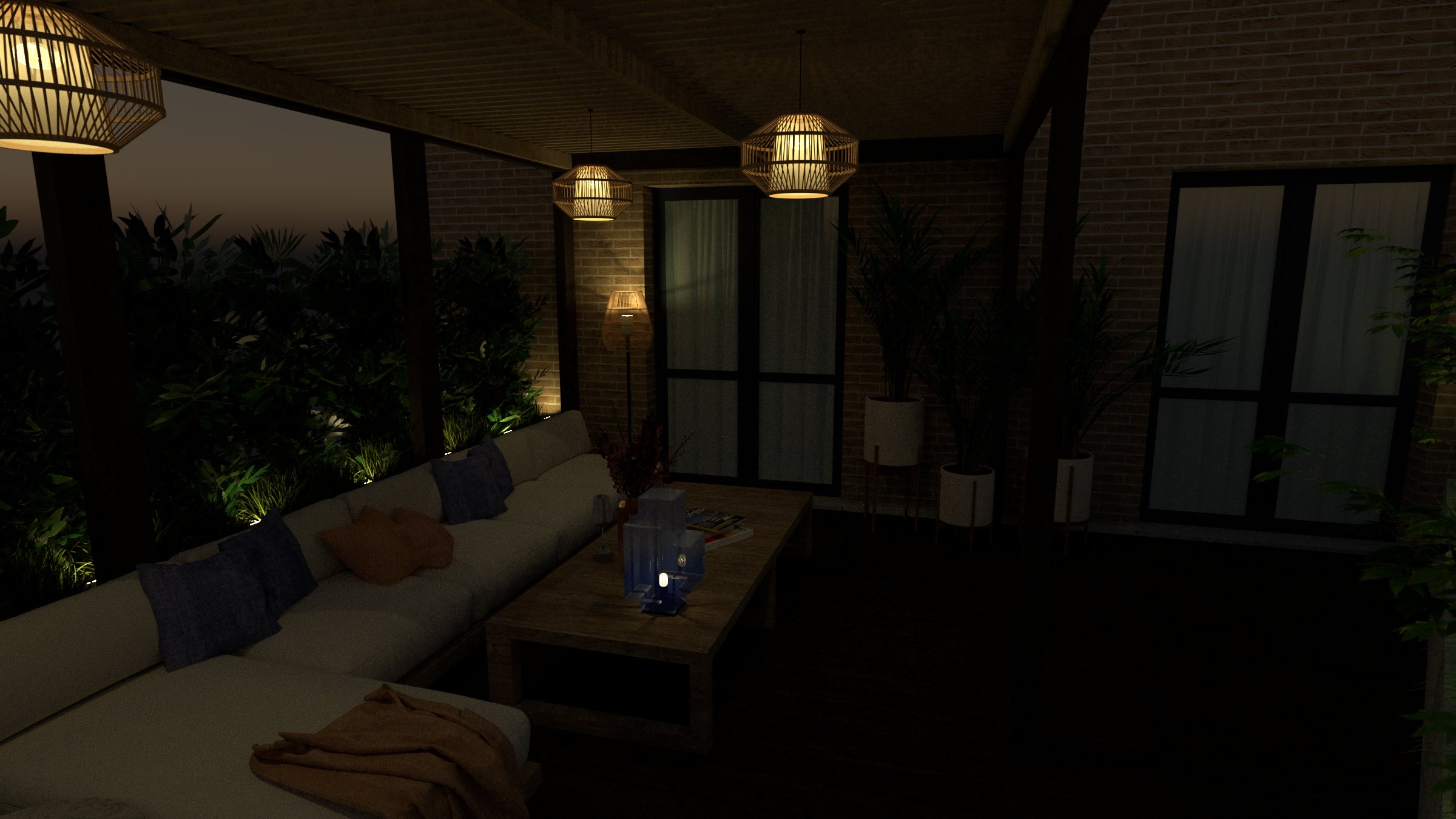 Wieczorami taras nabiera wyjątkowego uroku dzięki nastrojowemu oświetleniu – punktowym reflektorom umieszczonym przy roślinach, wiszącym pod pergolą lampom i subtelnym kinkietom. Dopełnieniem aranżacji jest prestiżowa sofa modułowa z grubymi, beżowymi poduszkami i stolik kawowy z kamiennym blatem. Całość tworzy komfortową strefę relaksu, w której nie zabrakło miejsca także na subtelne dodatki w postaci designerskich wazonów i lampek.