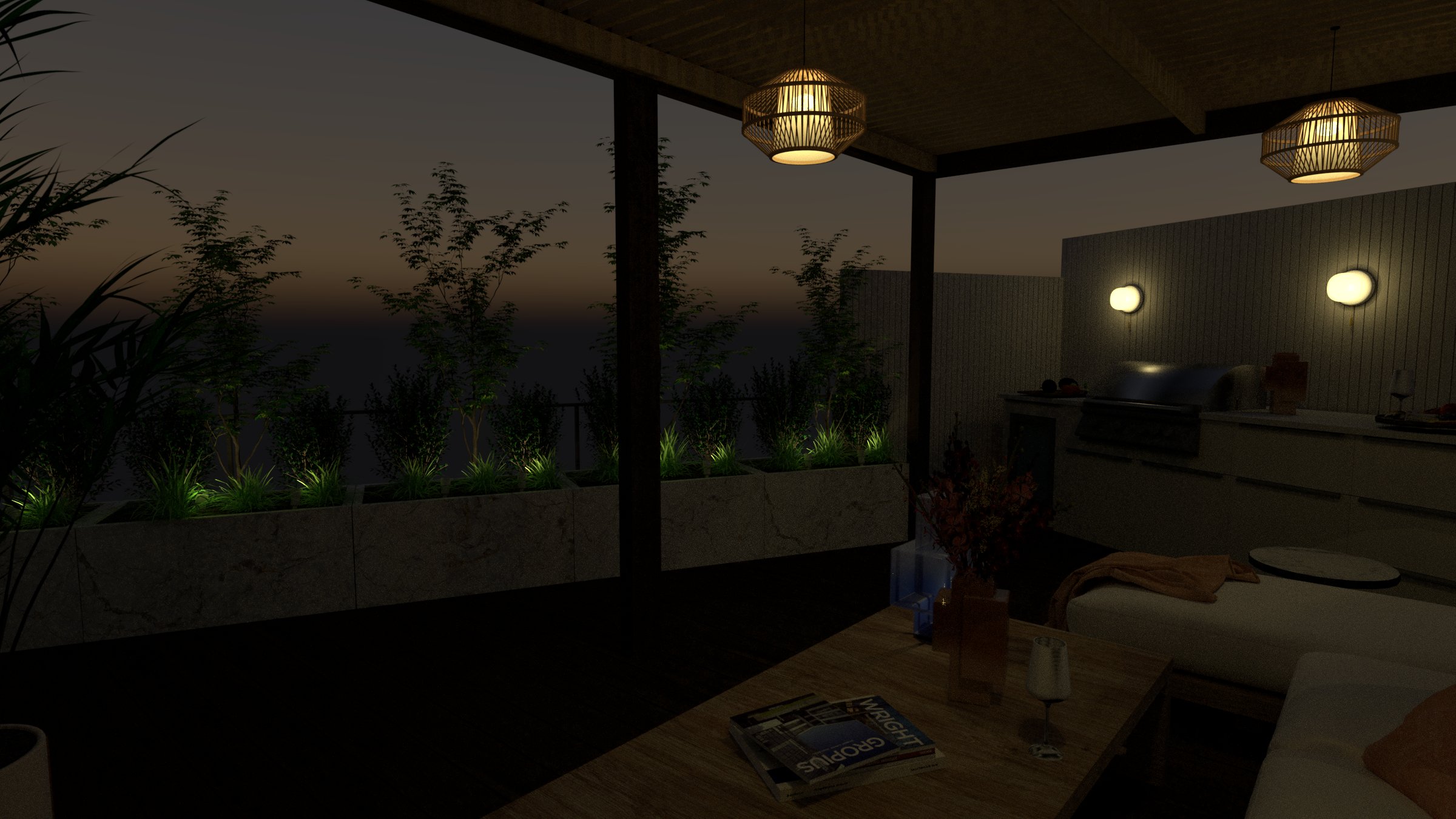 Za letnią kuchnią, wzdłuż balustrady zamontowaliśmy nowoczesne, ażurowe ekrany z drewna, które delikatnie przesłaniają przestrzeń, chroniąc przed wzrokiem sąsiadów oraz wiatrem. Ich pionowy układ dodaje lekkości i podkreśla nowoczesną linię projektu, nie odbierając przy tym naturalnego światła. Dodatkowego uroku dodają zamontowane na ekranie kinkiety o organicznym kształcie.